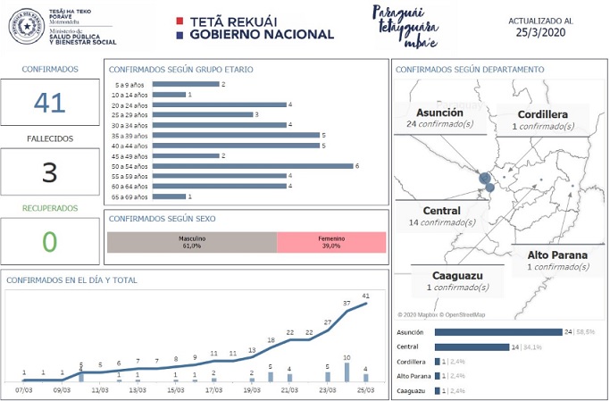 La distribución de los casos es la siguiente: Asunción (24), Central (14), Cordillera (1), Alto Paraná (1) y Caaguazú (1). Desde que llegó el primer positivo al país suman 41, tres de ellos fallecieron.