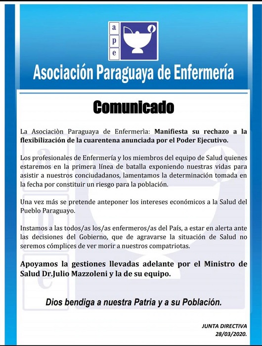 Otros como la Asociación Paraguaya de de Enfermería manifestó su rotundo “rechazo a la flexibilización de la cuarentena”, al tiempo de expresar su total apoyo al ministro Julio Mazzoleni y todo el equipo que lo acompaña, informó ABC Color.