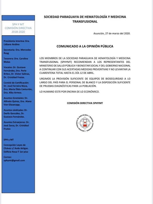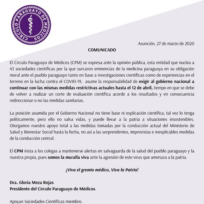 Algunos gremios como el Círculo de Médicos Paraguayos exigieron al Gobierno Nacional a continuar con las medidas estrictas hasta el 12 de abril próximo.
