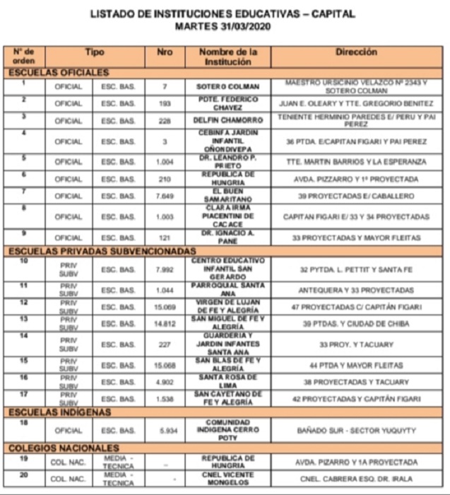 Lista de escuelas beneficiadas. Foto: IP Paraguay.