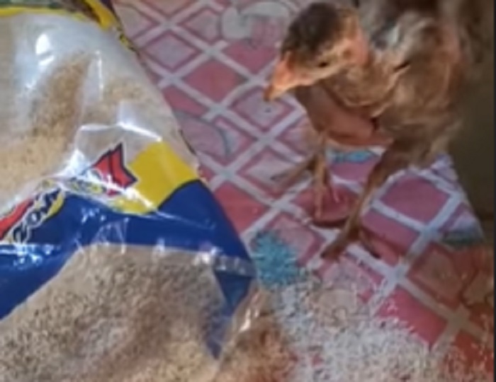 En un video se puede ver sobre una mesa diferentes productos de la canasta básica y un paquete de arroz abierto, y una gallina al lado.