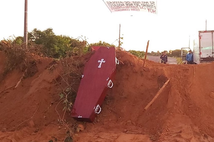 Todos los accesos a la ciudad de Ayolas, se encuentran totalmente bloqueados con montículos de arena y un ataúd en el medio.