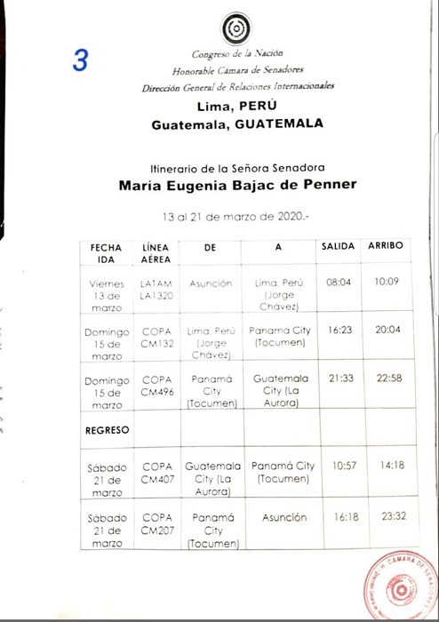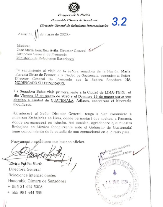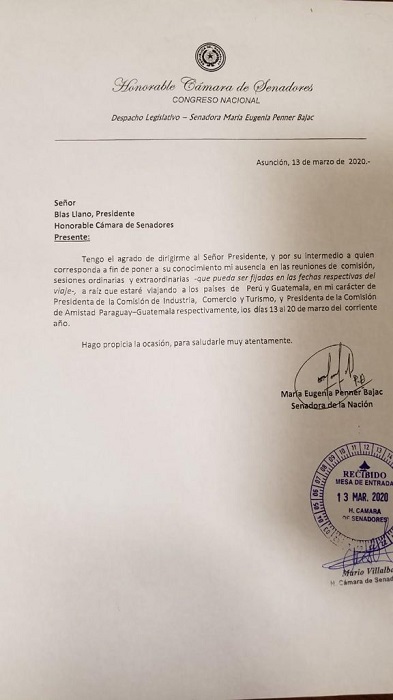 En la nota se dirige al presidente del Senado “a fin de poner a su conocimiento mi ausencia en las reuniones de comisión, sesiones ordinarias y extraordinarias – que pueda ser fijados en las fechas respectivas del viaje-, a raíz que estaré viajando a los países de Perú y Guatemala, en mi carácter de Presidenta de la Comisión de Industria, Comercio y Turismo, y Presidenta de la Comisión de Amistad Paraguay-Guatemala respectivamente, los días 13 al 20 de marzo del corriente año”.