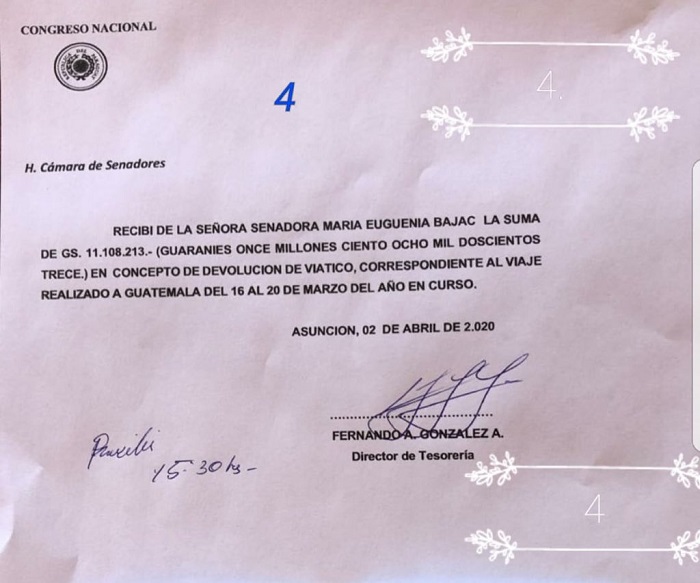 De acuerdo al recibo que fue firmado por el director de Tesorería de la Cámara de senadores, Fernando González, a la legisladora se le acreditó más de G. 11 millones en concepto de viático, desde el 16 al 20 de marzo, es decir unos G. 2.221.642 de gastos por día para un viaje (contando cinco días).