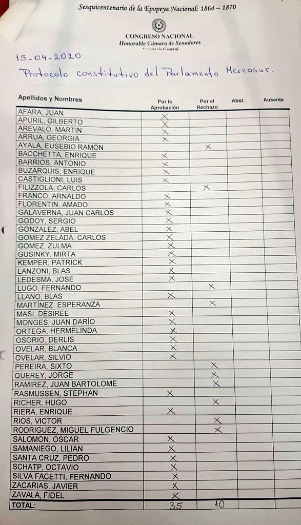 “Con 35 votos a favor queda aprobado Proyecto de Ley “Que aprueba el protocolo adicional al Protocolo Constitutivo del Parlamento del Mercosur”, firmado el 16 de abril de 2019 y pasa a la Cámara de Diputados”, informó la cuenta en redes del Senado.