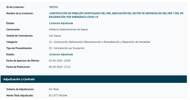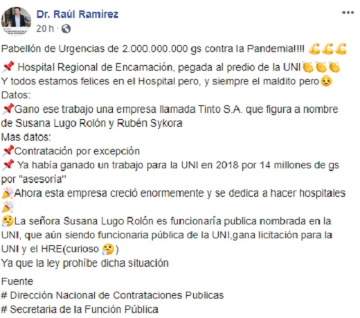 El profesional público en su cuenta de Facebook y mencionó a RDN que para la construcción del pabellón se invirtió cerca de G. 2.000 millones a fin de utilizar el espacio para atender los casos de coronavirus.