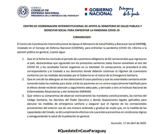 Indicaron también que en la fecha concluyó la cuarentena de otros 82 compatriotas que ingresaron al país y todos ellos dieron negativo al test de Covid-19.