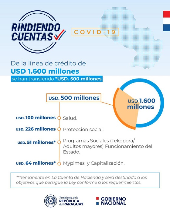 De dicho monto, USD 100 millones fueron destinados a Salud, USD 226 millones a programas de protección social. Estos son Ñangareko, Pytyvo e IPS.