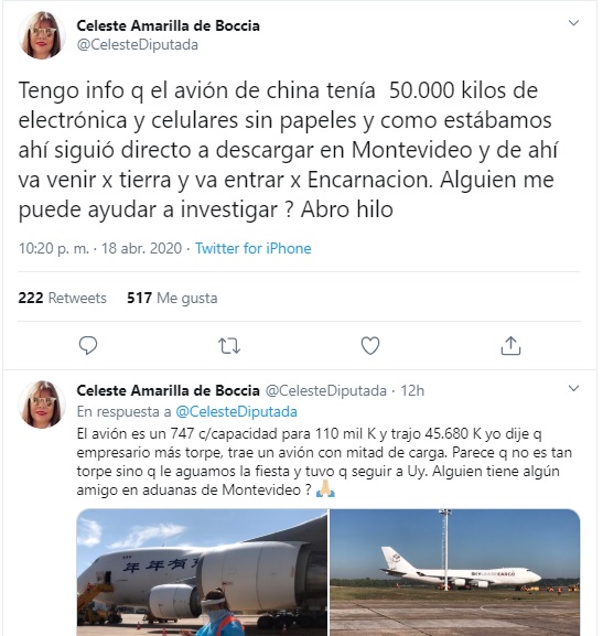 De acuerdo a la información que dice haber reunido la legisladora, el avión contaba con “50.000 kilos de electrónica y celulares sin papeles”. “Como estábamos ahí siguió directo a descargar en Montevideo”, explicó.
