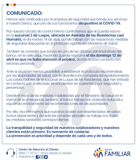 “Por nuestro circuido de control interno confirmamos que el guardia estuvo en la sucursal 2 de Luque, ubicada en Avenida de las Residentas casi Humaitá, el día martes 14 de abril, donde trabajó con las respectivas medidas de seguridad dispuestas en el protocolo vigente del Ministerio de Salud”, informa el escrito.
