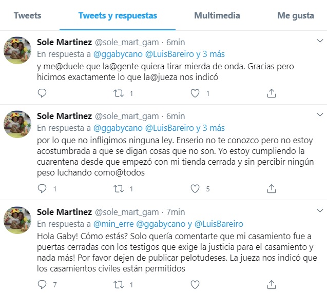 “Por favor dejen de publicar pelotudeses. La jueza nos indicó que los casamientos civiles están permitidos”, manifestó.