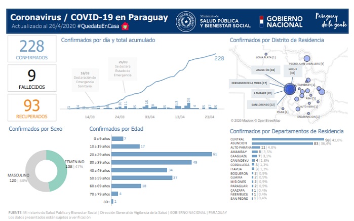 Este domingo 26, es decir 10 días después, se informó de 228 casos confirmados, nueve fallecidos y 93 recuperados, es decir 126 pacientes con el virus activo. Comparando las cifras se puede apreciar una disminución del 22%.