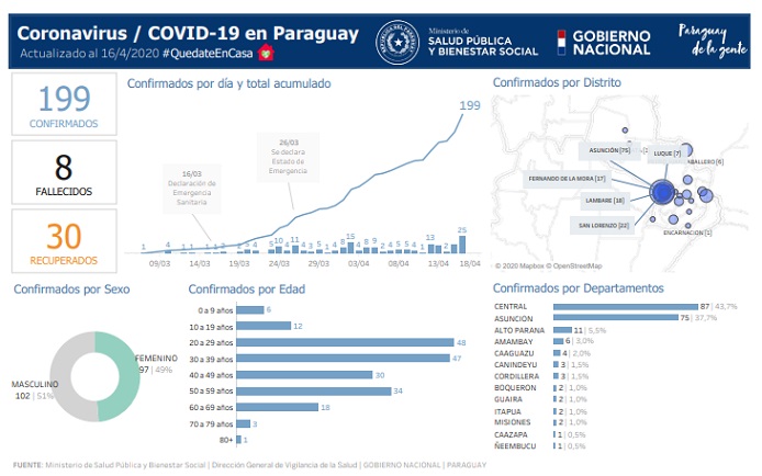 El 16 de abril las cifras eran las siguientes: 199 casos confirmados, ocho fallecidos y 30 recuperados, dando como resultado 161 pacientes con el virus activo.