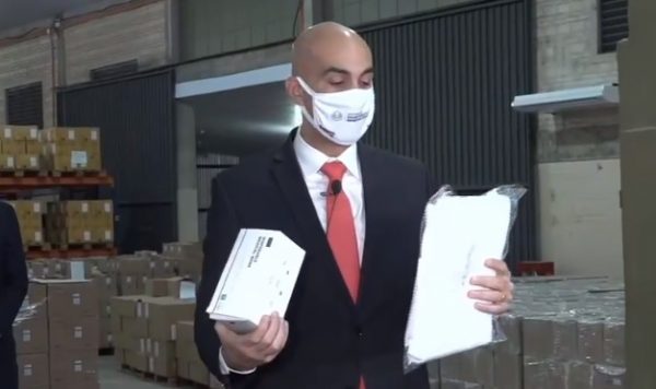 mazzoca Mazzoleni en conferencia de prensa con los insumos rechazados un tiempo atrás. Foto: Captura.