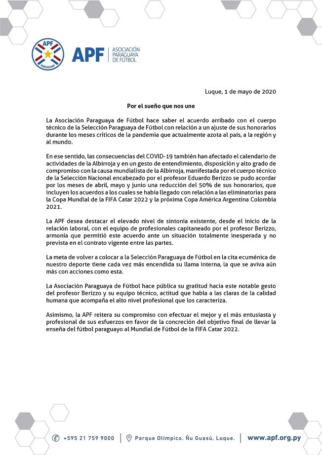 De acuerdo a lo informado por la APF mediante un comunicado, Berizzo y su cuerpo técnico resigna el 50% de sus honorarios por los meses de abril, mayo y junio.