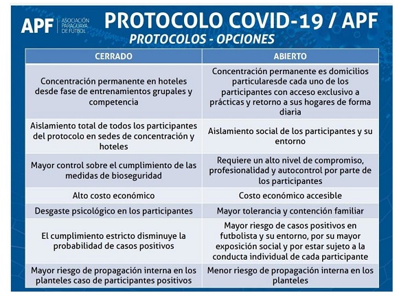 Mientras que los médicos de los distintos clubes sugirieron avanzar con el protocolo abierto, alegando que la implementación se dará en coincidencia con la fase descendente de la curva de la pandemia. Anunciaron que se realizará una nueva reunión a finales de este mes, informaron desde la APF.