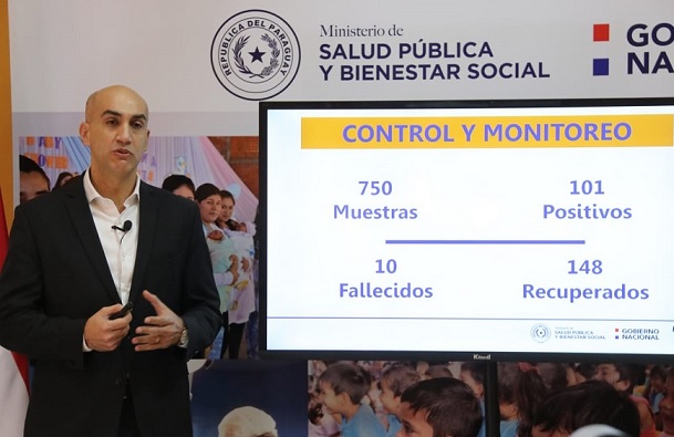 “Informe #COVID19 | 8 de mayo: procesamos 750 muestras, 101 positivos: 98 del exterior (97 de Brasil, 1 de Europa, en cuarentena obligatoria en albergues), 2 contactos y 1 sin nexo. 7 internados. 4 recuperados, sumando 152. Total confirmados: 563”, tuiteó el ministro.