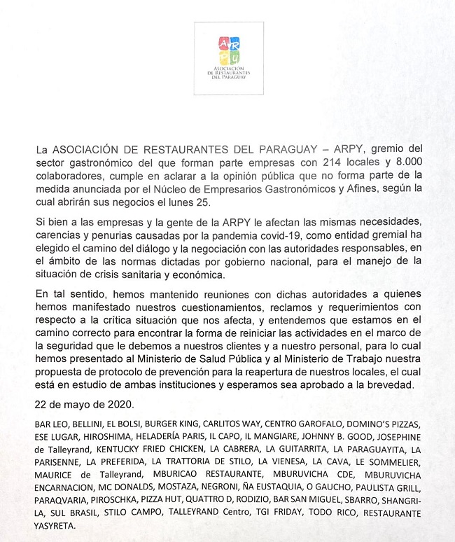 La Asociación de Restaurantes del Paraguay emitió un comunicado para aclarar a la opinión pública que no son parte de la medida anunciada por el Núcleo de Empresarios Gastronómicos y Afines apertura de locales desde este lunes 25.