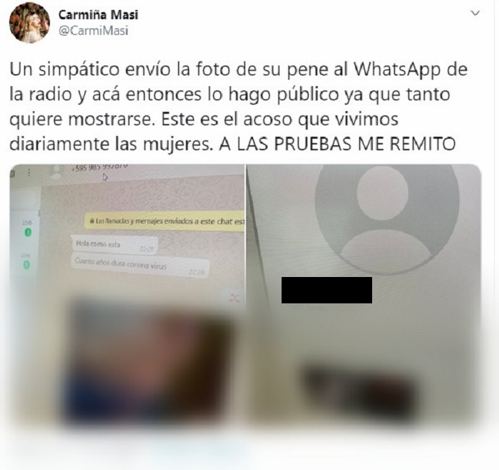 “Un simpático envío la foto de su pene al WhatsApp de la radio y acá entonces lo hago público ya que tanto quiere mostrarse”, afirmó en la publicación.