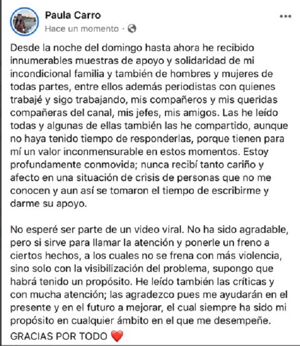“Estoy profundamente conmovida, nunca recibí tanto cariño y afecto en una situación de crisis, de personas que no me conocen y aun así se tomaron el tiempo de escribirme y darme su apoyo”, mencionó la periodista en su publicación.