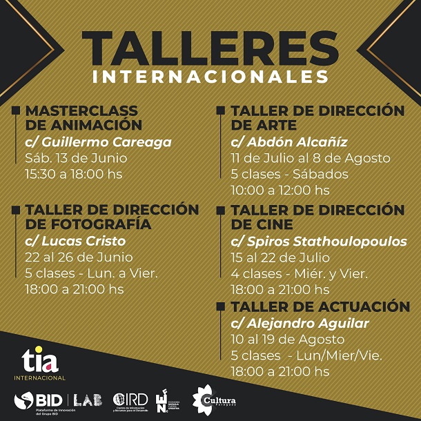 TIATalleres Internacionales consiste en Talleres Virtuales de Dirección de Cine, Dirección de Fotografía, Dirección de Arte, Actuación para Cine y una Masterclass de Animación, que se llevarán a cabo entre los meses de Junio y Agosto del 2020, las clases serán dictadas por docentes con trayectoria internacional dentro del ambiente cinematográfico.