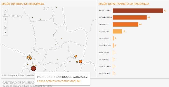 De acuerdo al mapa interactivo compartido por la cartera de Estado, Paraguarí es el departamento con mayor cantidad de casos en la comunidad, con 71. La cifra más elevada se encuentra en Roque González de Santa Cruz, donde hay un total de 62.