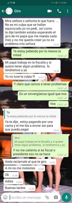 En los mensajes no solo se puede ver la negativa de Ayelen para devolver el dinero, sino que también una amenaza de que si la mujer intentaba denunciarle, esta acudiría a su padre, quien es fiscal, por lo que toda acusación en su contra sería en vano.