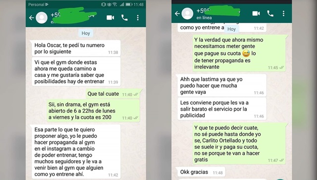 Captura de un chat donde un «autodefinido influencer» busca obtener gimnasio gratis.