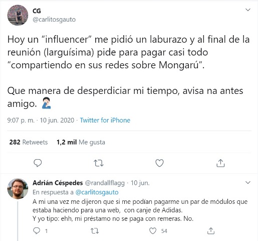 En otro tuit, Carlos Gauto, que trabaja en marketing y diseño gráfico, expuso: “Hoy un ‘influencer’ me pidió un laburazo y al final de la reunión (larguísima) pide para pagar casi todo “compartiendo en sus redes sobre Mongarú. Qué manera de desperdiciar mi tiempo, avisa na antes”.
