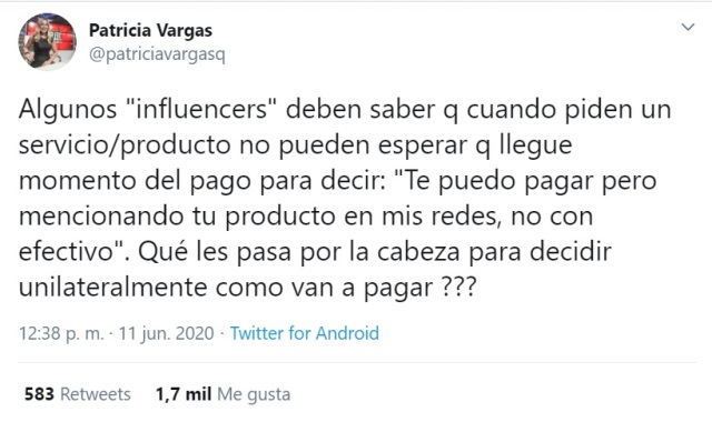 “Algunos «influencers» deben saber que cuando piden un servicio/producto no pueden esperar que llegue el momento del pago para decir: «Te puedo pagar pero mencionando tu producto en mis redes, no con efectivo». ¿Qué les pasa por la cabeza para decidir unilateralmente como van a pagar?”.
