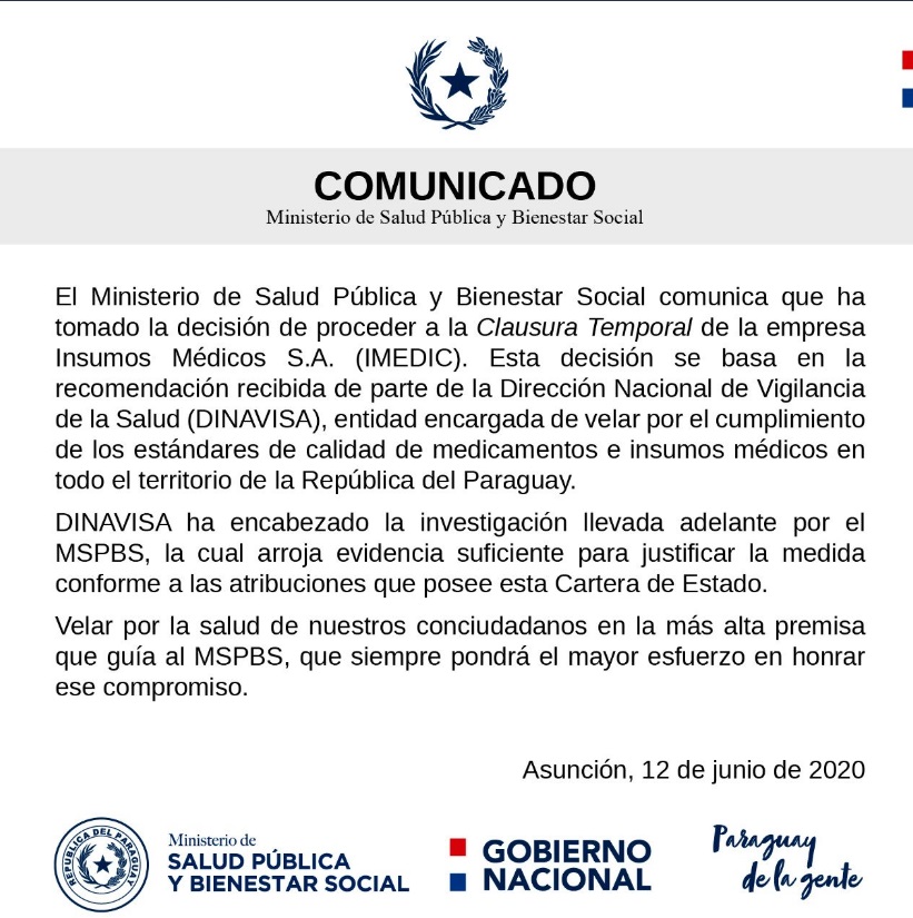 “Esta decisión se basa en la recomendación recibida de parte de la Dirección Nacional de Vigilancia de la Salud (DINAVISA), entidad encargada de velar por el cumplimiento de los estándares de calidad de medicamentos e insumos médicos en todo el territorio de la República del Paraguay”, agrega.