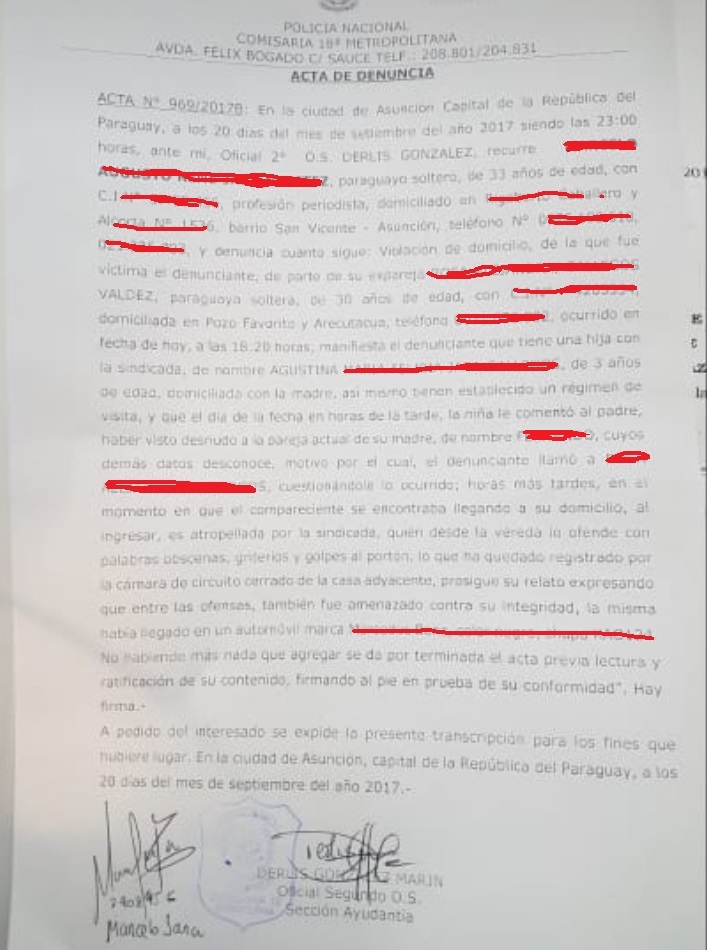 Acta de denuncia de septiembre de 2017 donde el hoy acusado señala a la denunciante.