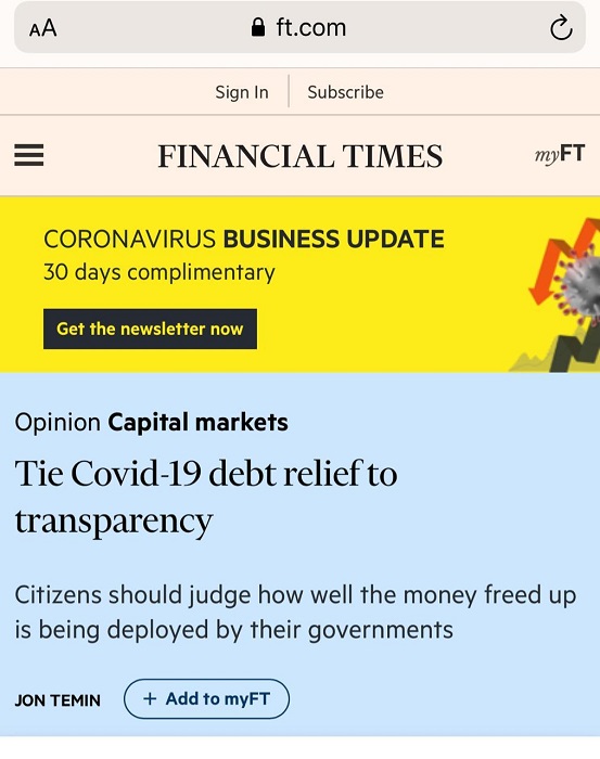 Un artículo del Financial Times analizó la importancia de gestionar con transparencia el endeudamiento contraído por los países, durante la pandemia del Covid-19.