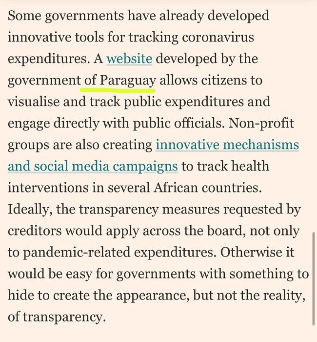 Así es como menciona a Paraguay como un ejemplo, en estos tiempos de pandemia, por desarrollar una página web en la que cualquier persona puede buscar y visualizar el avance en la distribución de los recursos.