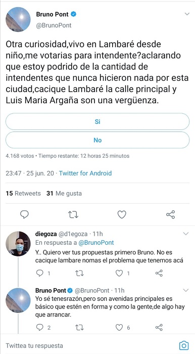 “Otra curiosidad,vivo en Lambaré desde niño, me votarías para intendente? Aclarando que estoy podrido de la cantidad de intendentes que nunca hicieron nada por esta ciudad, Cacique Lambaré la calle principal y Luis Maria Argaña son una vergüenza”, lanzó el  comunicador desde su cuenta.