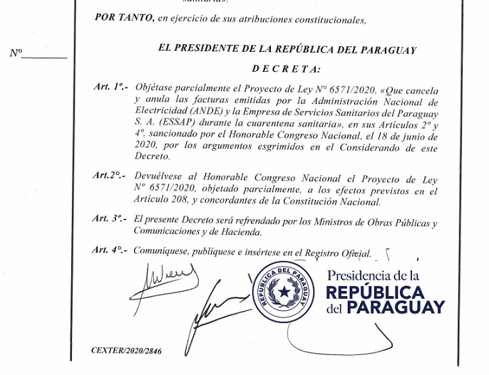 El presidente vetó parcialmente la ley que anula las facturas de ANDE y ESSAP de los meses de marzo, abril, mayo, junio, julio y agosto.