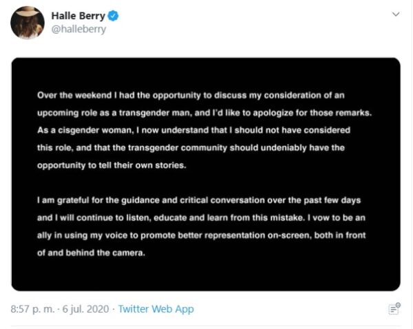La actriz Halle Berry renunció a interpretar a un transgénero para una película luego de la presión recibida en redes sociales. La cuestión comenzó durante una charla con la estilista Christin Brown en Instagram Live cuando Berry relató que le ofrecieron un personaje para una nueva película.