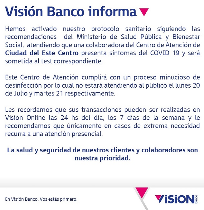“Hemos activado nuestro protocolo sanitario siguiendo las recomendaciones del Ministerio de Salud Pública y Bienestar Social, atendiendo que una colaboradora del Centro de Atención de Ciudad del Este Centro presenta síntomas del COVID 19 y será sometida al test correspondiente”, señala el comunicado publicado en redes sociales.