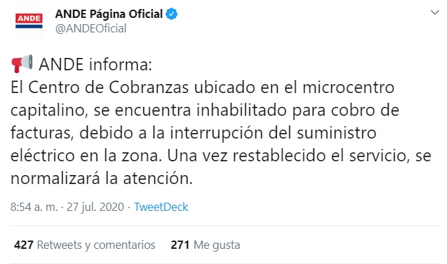 El Centro de Cobranzas ubicado en el microcentro capitalino, se encuentra inhabilitado para cobro de facturas, debido a la interrupción del suministro eléctrico en la zona. Una vez restablecido el servicio, se normalizará la atención”, fue lo que informó la estatal en su cuenta en Twitter.