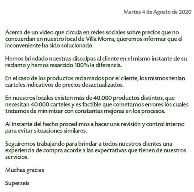“En nuestros locales existen más de 40.000 productos distintos, que necesitan 40.000 carteles y es factible que cometamos errores los cuales tratamos de minimizar con constantes mejoras en los procesos”, afirma el comunicado.