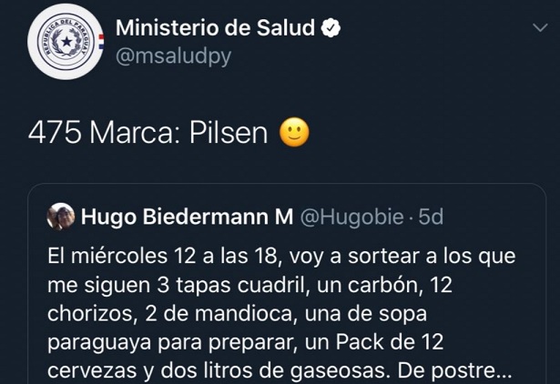 En la mañana de este miércoles, un desafortunado tuit del Ministerio de Salud nombró la publicación con el siguiente escrito: “475 Marca: Pilsen”.
