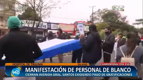 Enfermeros y funcionarios de limpieza del Hospital del Trauma cerraron una calzada de la avenida General Santos, frente mismo al centro asistencial.