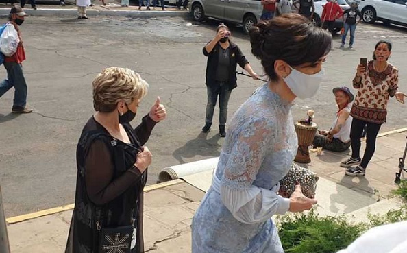 Un grupo de personas con las caras pintadas llegó hasta la Catedral Metropolitana para escrachar a Sol Cartes, en su boda registrada en plena pandemia.