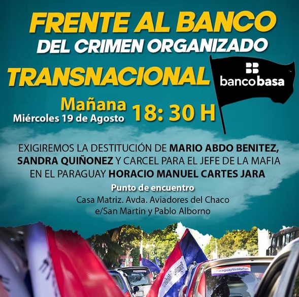 El presidente del Partido Liberal Radical Auténtico (PLRA), Efraín Alegre, anunció a partir de las 18:30, se realizará una manifestación frente a la sede del banco Basa, propiedad de Horacio Cartes, a fin exigir que se haga justicia en el caso del asesinato del joven dirigente liberal, Rodrigo Quintana.