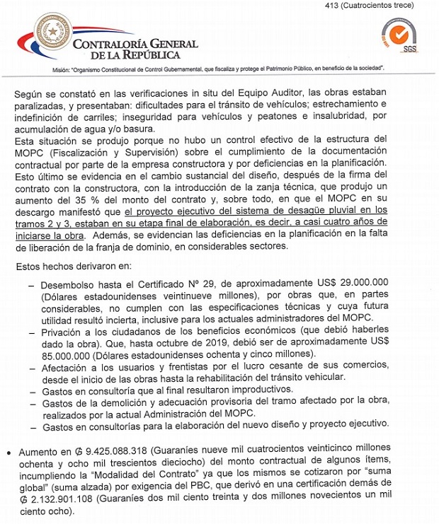 Señaló que también se detectó perjuicio económico en varios casos puntuales, entre los que dijo: más de G. 2.000 millones en concepto de alteración de contrato, más de G.14.000 millones de en falta de aplicación de multas, G. 8.000 millones en cuanto a cumplimiento de especificaciones técnicas, diferencia de 510 millones en franja técnica, añadió que estos cortes los hicieron en el mes de octubre.