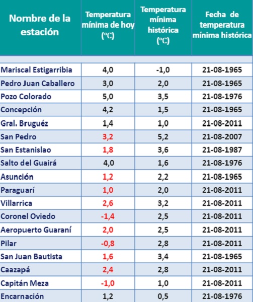 De acuerdo a la tabla de valores, Coronel Oviedo (-1.4°C), Capitán Meza (-1.0°C) y Pilar (-0.8°C) son las localidades con las temperaturas más bajas registradas, que incluso superando sus récords anteriores.