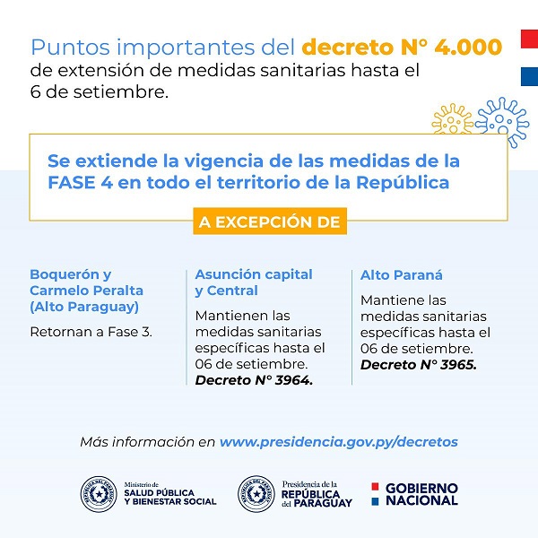 En el documento se establece que la Fase 4 se extiende en todo el país hasta el 6 de setiembre, excepto en Asunción y los departamentos de Central, Alto Paraná y Boquerón.