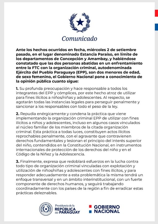 En el primer punto, el escrito señala lo siguiente: “Su profunda preocupación y hace responsable a todos los integrantes del EPP y cómplices, por este hecho atroz de utilizar para fines ilícitos a niños/niñas y adolescentes. Al respecto, se agotarán todas las instancias legales para perseguir penalmente y sancionar a los responsables con todo el peso de la ley”.