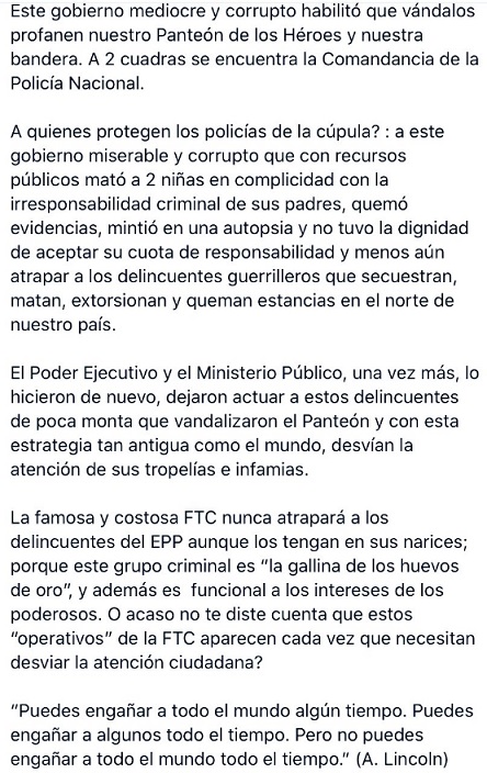 En un posteo en redes sociales, la legisladora deja en claro su postura. “Este gobierno mediocre y corrupto habilitó que vándalos profanen nuestro Panteón de los Héroes y nuestra bandera. A 2 cuadras se encuentra la Comandancia de la Policía Nacional”, comenzó señalando.