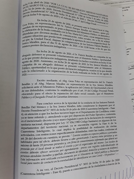 En ese sentido, la representante del Ministerio Público alegó que la boda se realizó en Cordillera, departamento que ya estaba en fase 4, mediante decreto 3835/2020.